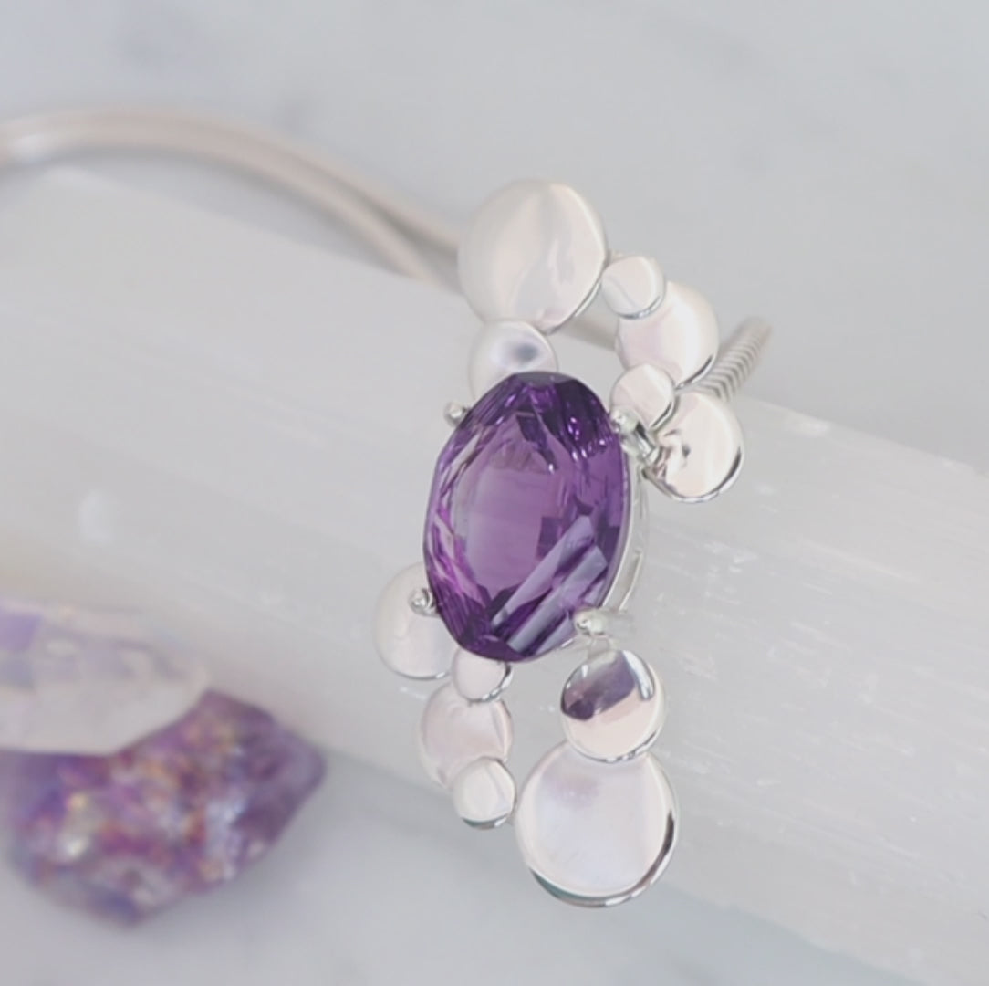 A sumptuous and majestic 17ct, 20x14mm Fancy cut Amethyst with surrounding silver circular droplets that create a puddle effect.