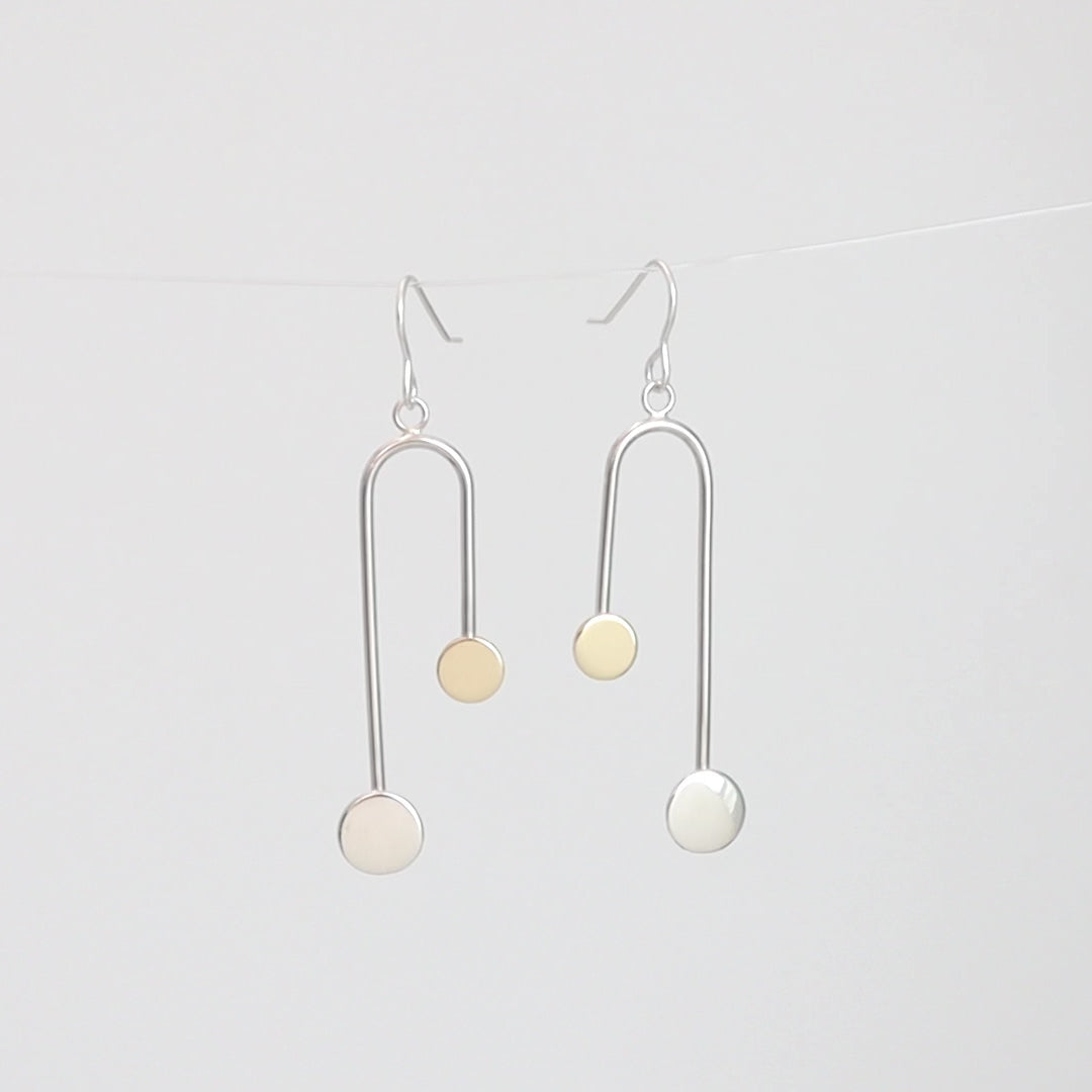 Statement dangling earrings featuring beautiful Sterling silver and 9carat yellow gold polished details. The earrings are mounted on Sterling silver hooks that simply push through the ear and do not require a butterfly or ear back.