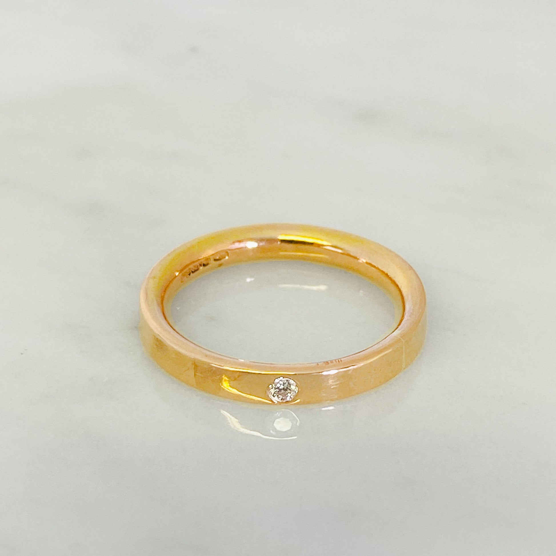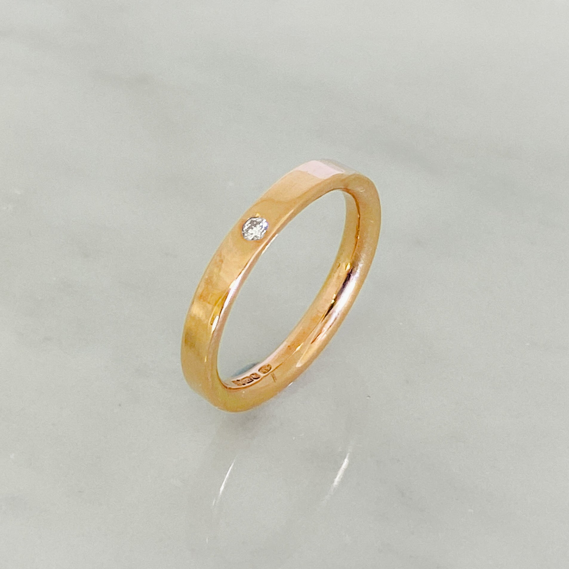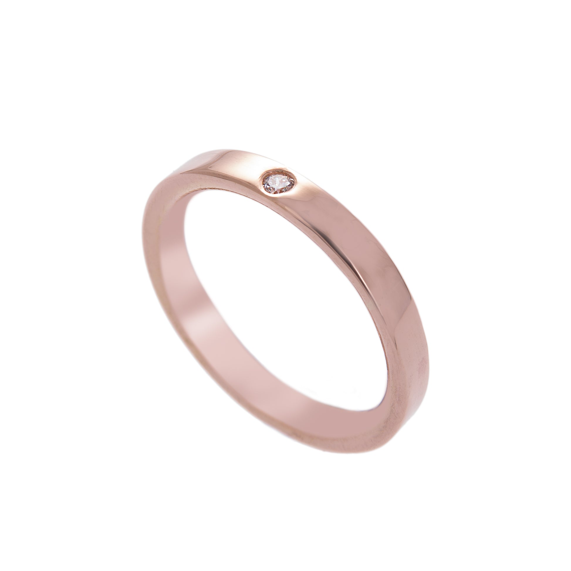 A contemporary take on a traditional ring in smooth polished rose gold with a flush set sparkling diamond.