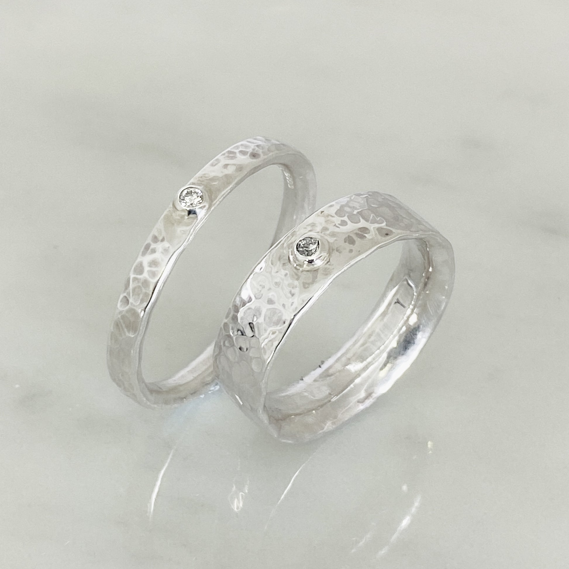 The ring has been given a high polish and the added surfaces from the texture provide additional sparkle, giving a beautiful twinkling band. A diamond is set within the band meaning it is entirely flat and smooth.