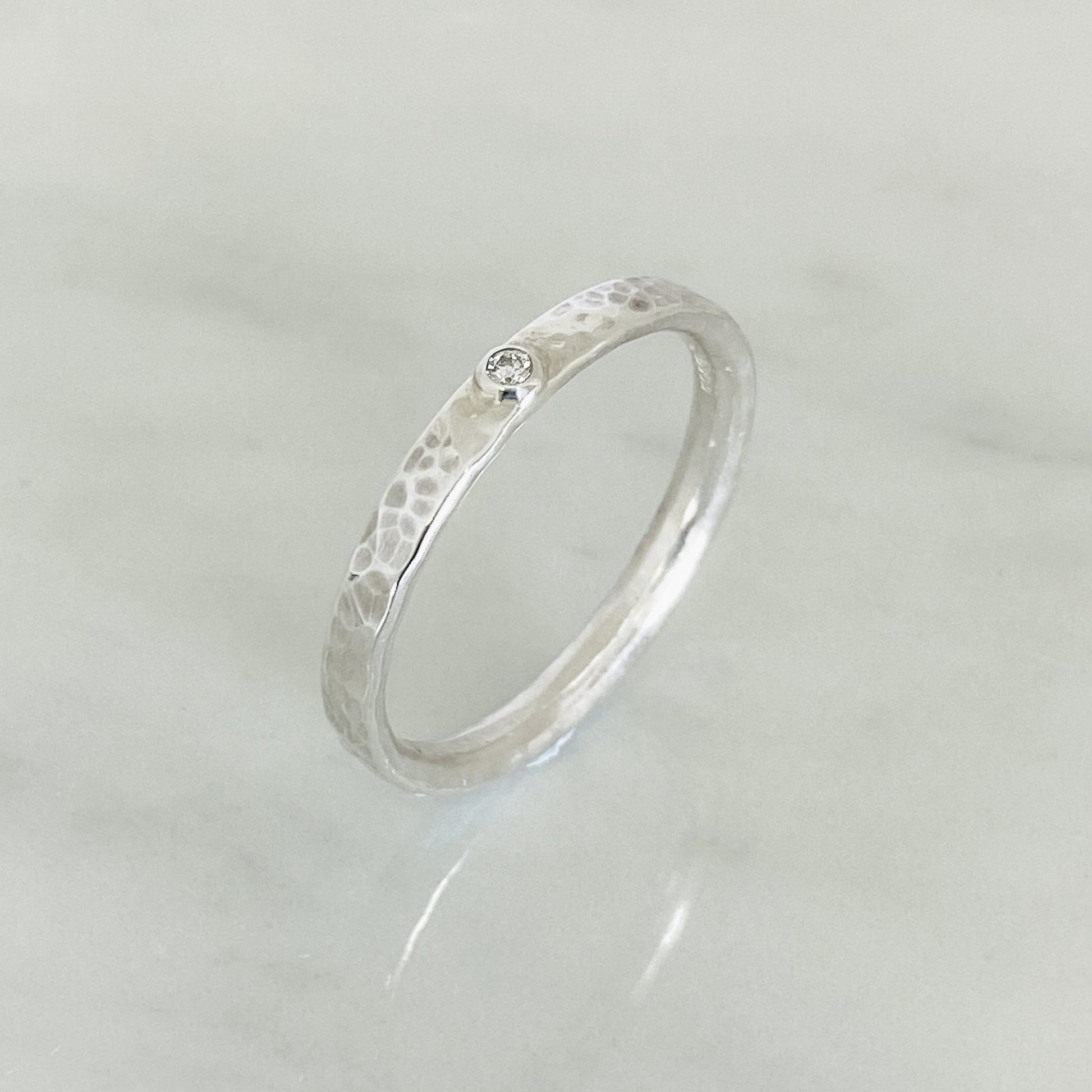 A contemporary take on a traditional ring in white gold with a hand hammered texture on the surface giving a dimpled effect and a bezel set sparkling diamond.