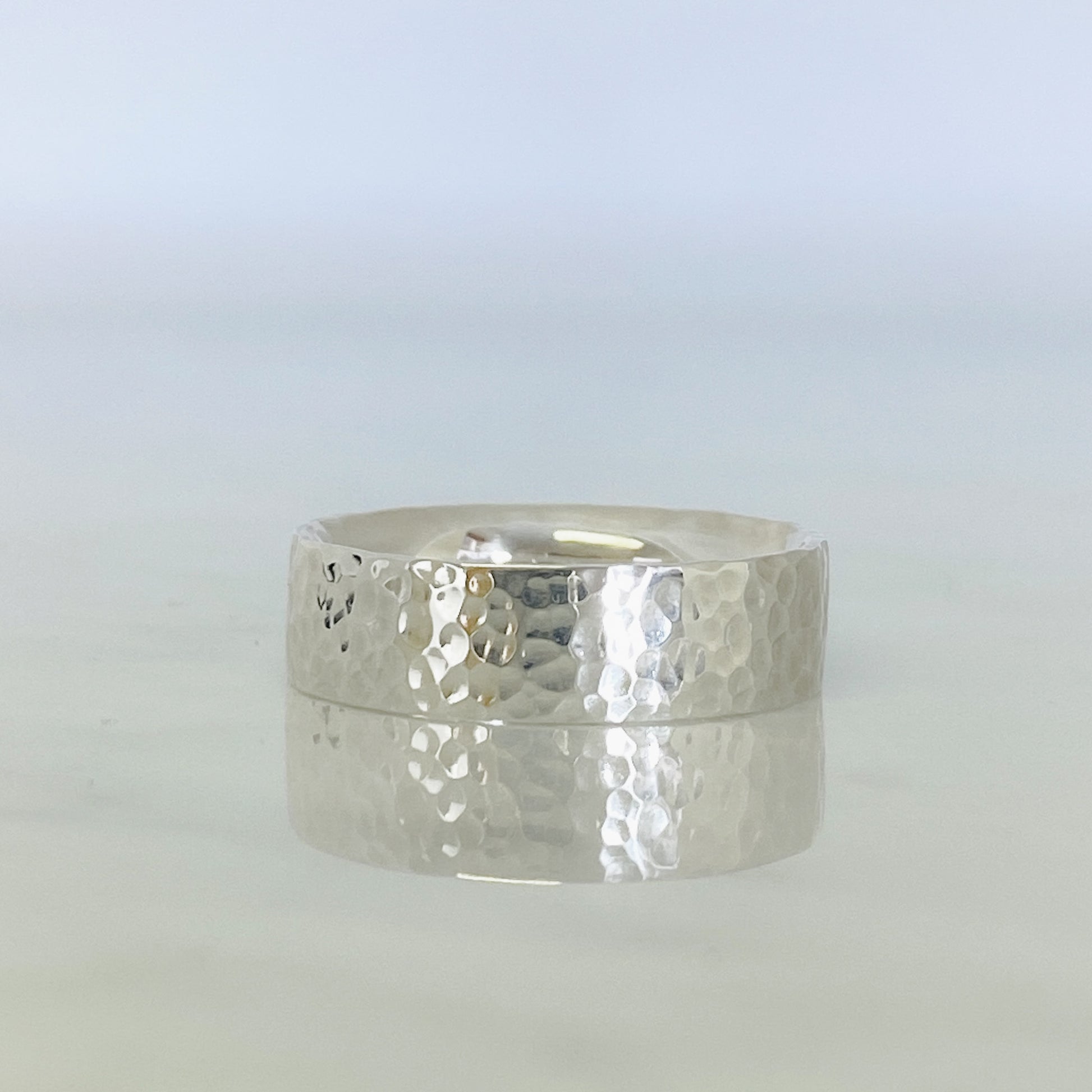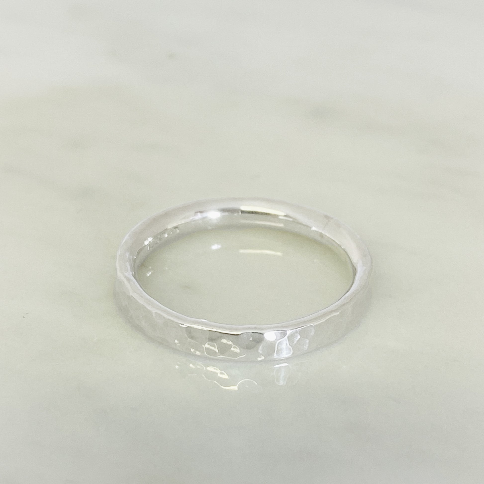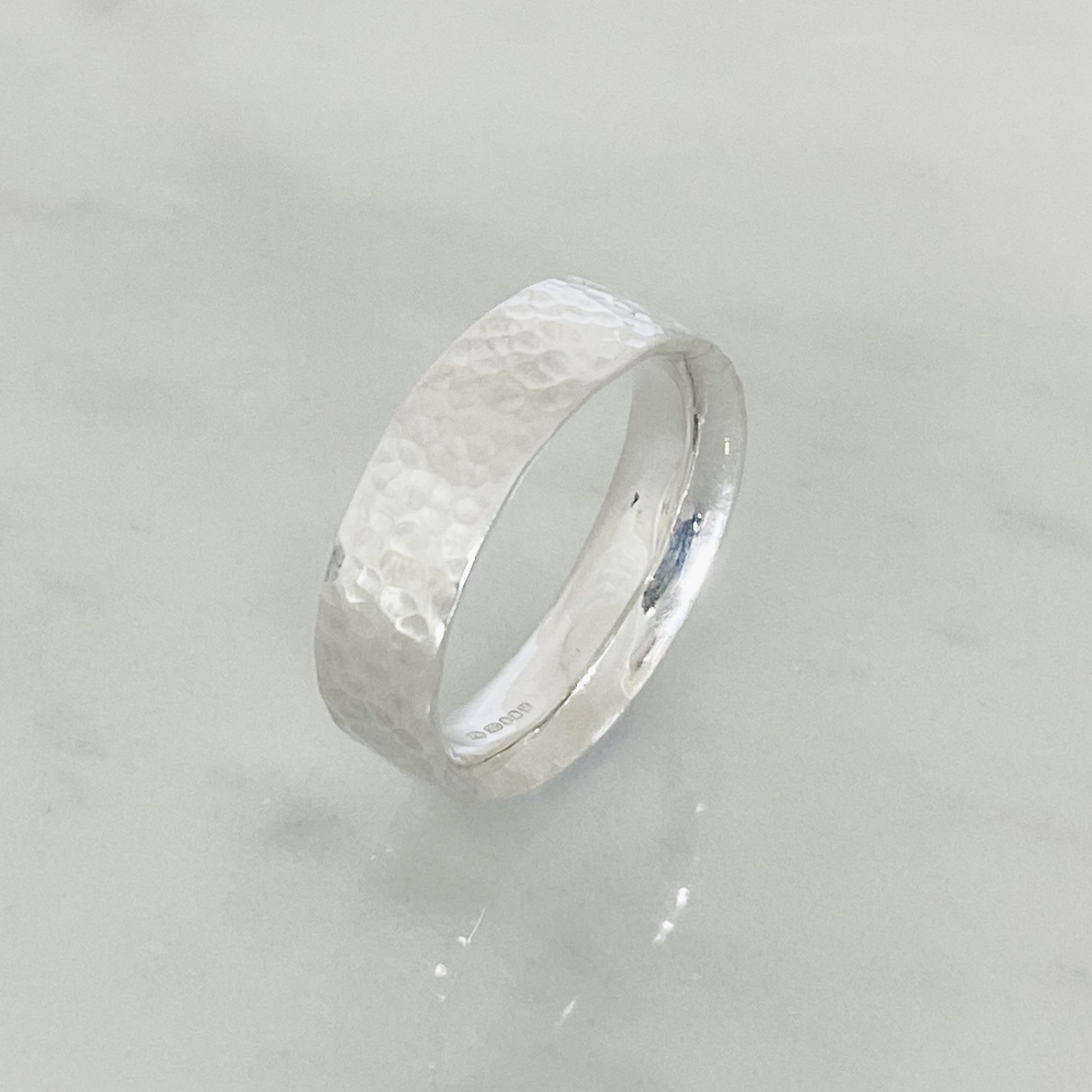 A contemporary take on a traditional ring in white gold with a hand hammered texture on the surface giving a dimpled, faceted effect.