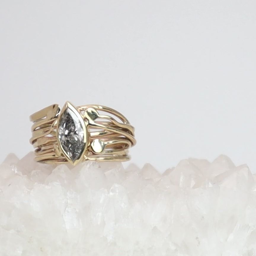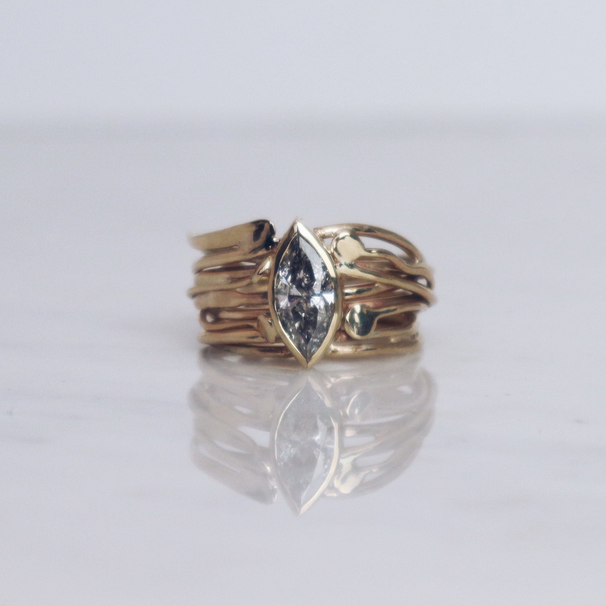Always popular, Angela's flowing rings feature a selection of stones in varying sizes and colours. Taking centre stage on this ring is a stunning 13x6.5mm, 1.26ct Salt and Pepper Diamond set on a 9ct yellow gold flowing band, this is a truly unique piece to treasure for a lifetime.