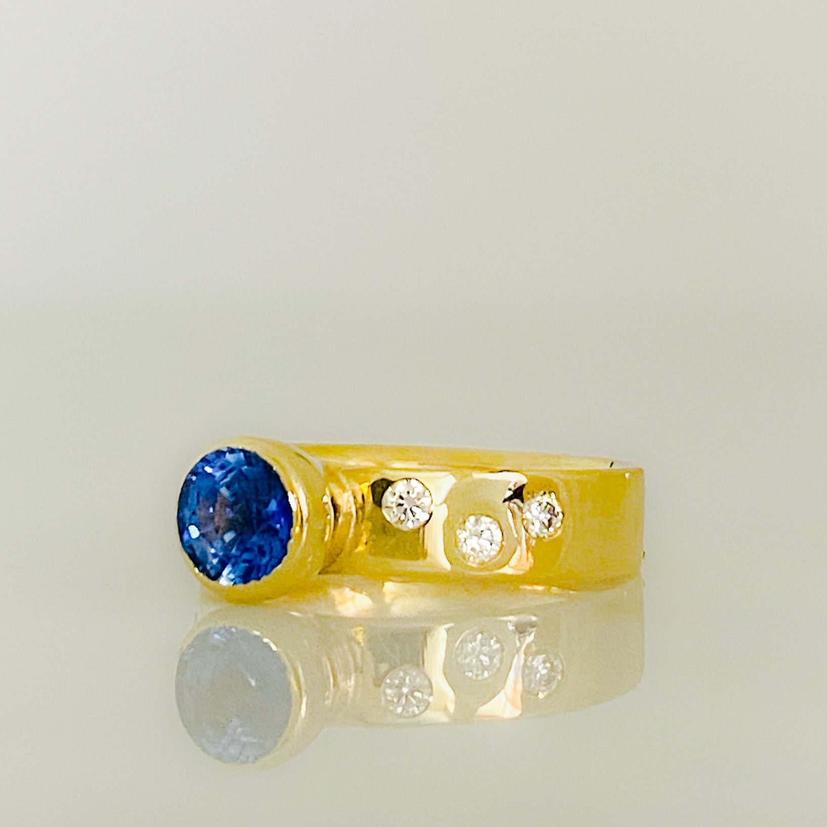 A bold, contemporary engagement ring in smooth polished gold with a large 6mm wide Blue Sapphire in an elegant bezel setting. The bezel is set on top of a 5mm wide comfort fit band that is square and bold on the outer side but curved for comfort on the inside, the band features scattered diamonds in the shoulders for added sparkle.