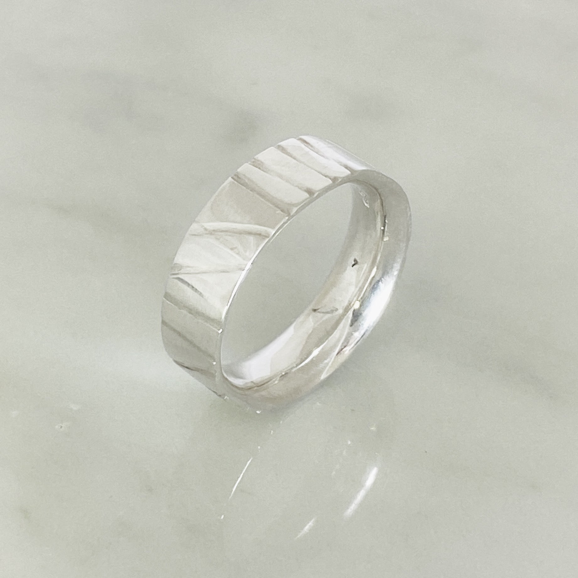 A contemporary take on a traditional ring in sterling silver with a hand drawn pattern adding interest to the surface. The pattern is reminiscent of roman numerals giving the idea of the passage of time and everlasting love.