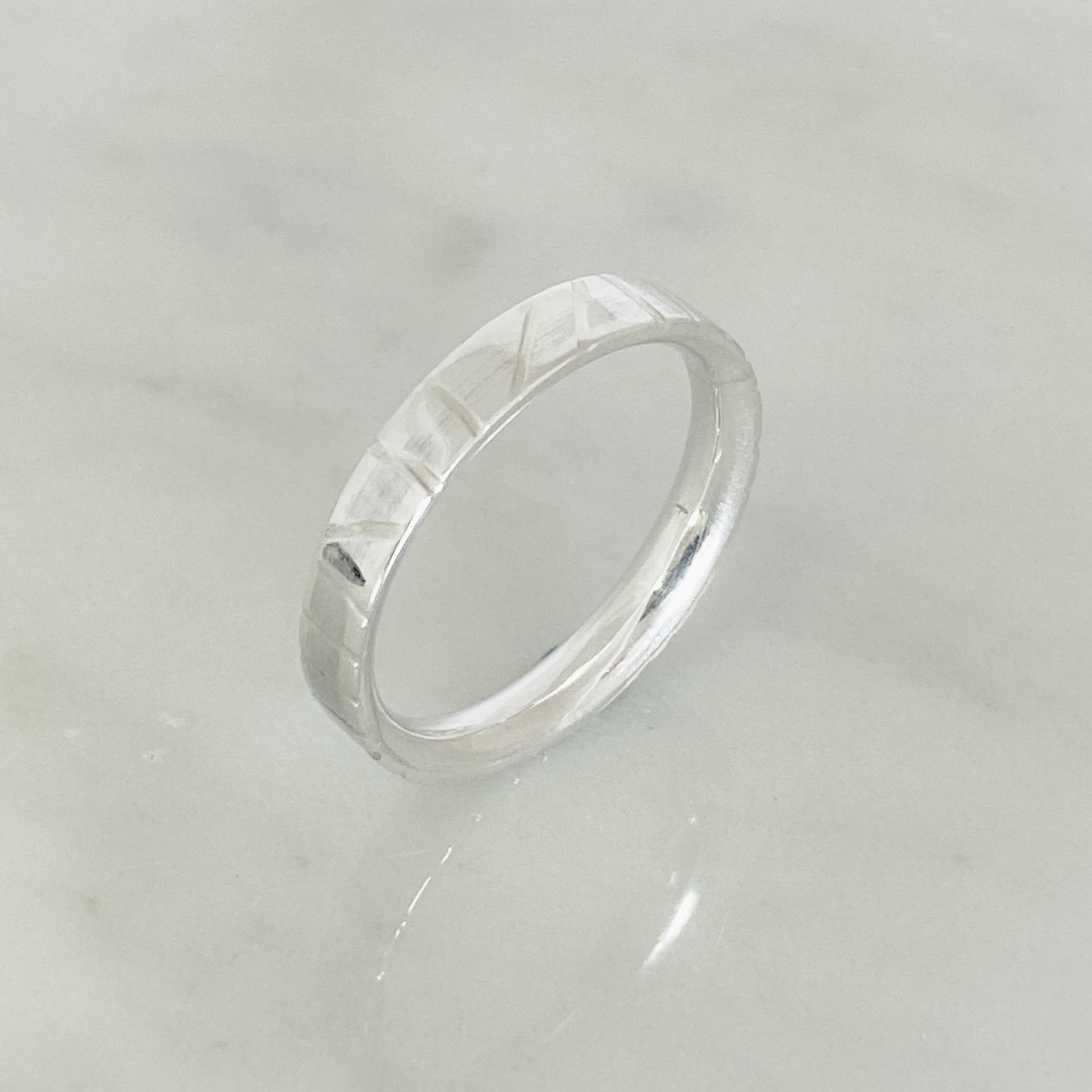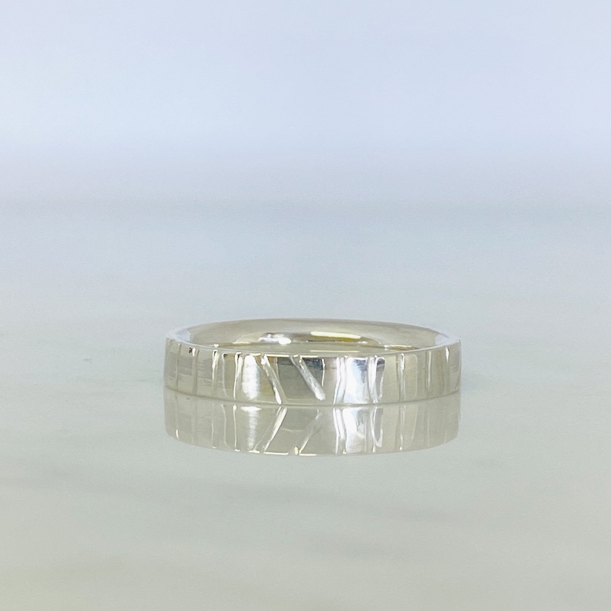 A contemporary take on a traditional ring in white gold with a hand drawn pattern adding interest to the surface.