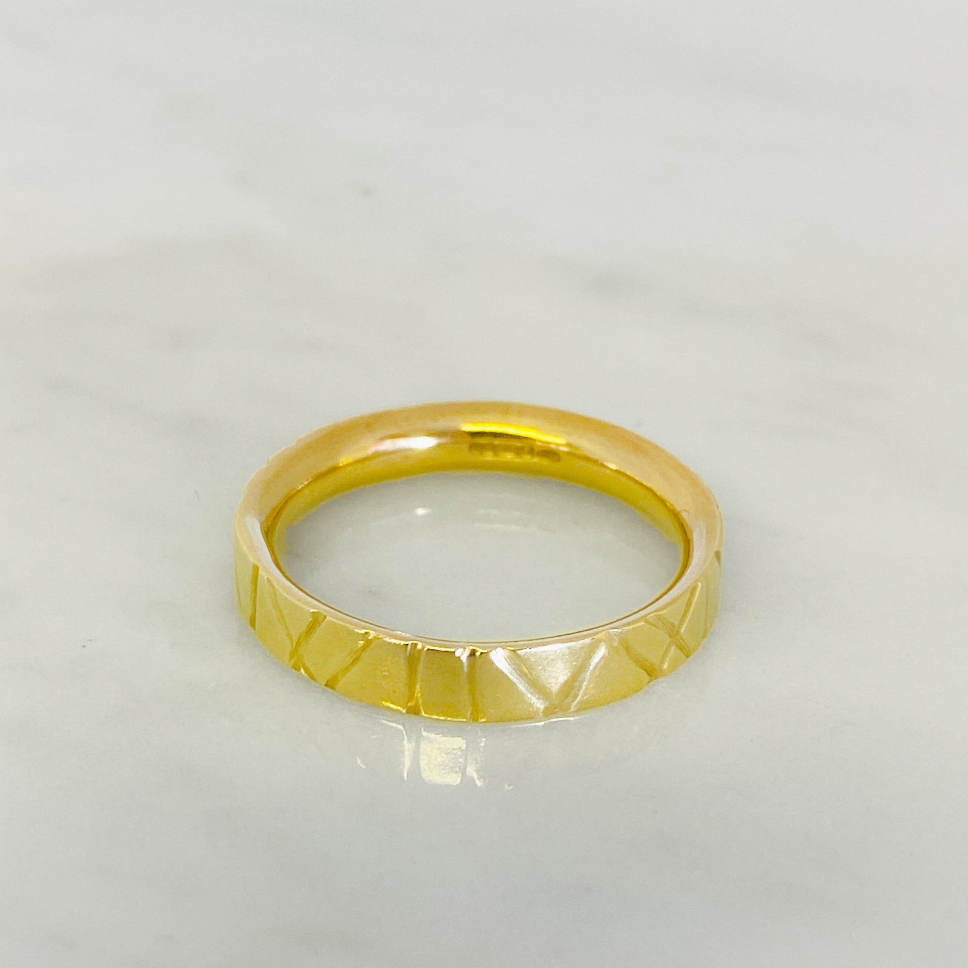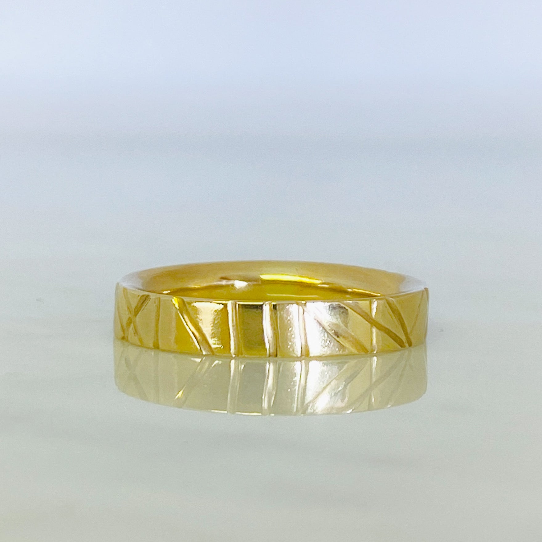 A contemporary take on a traditional ring in yellow gold with a hand drawn pattern adding interest to the surface. The pattern is reminiscent of roman numerals giving the idea of the passage of time and everlasting love.
