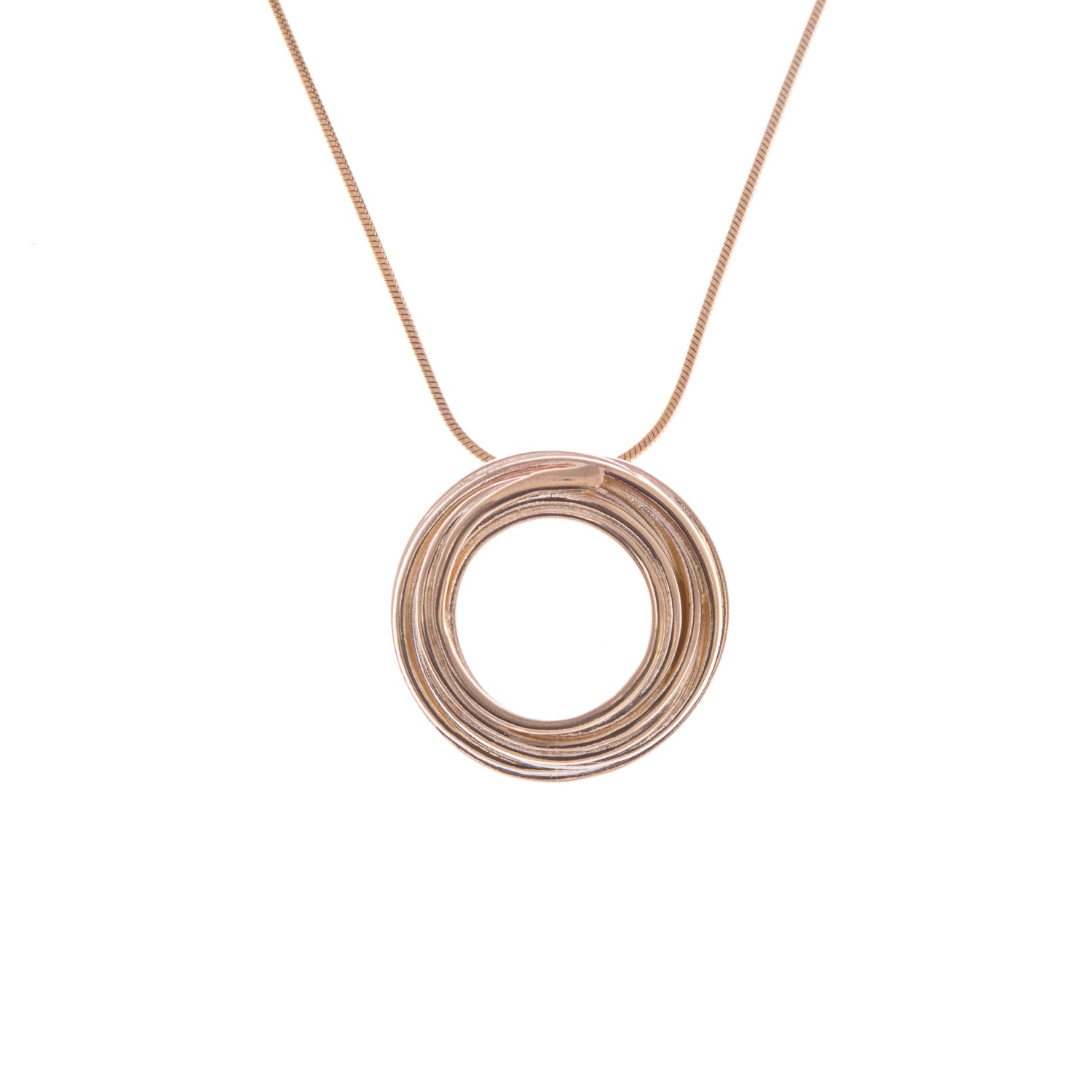 A striking pendant formed of intricately wrapped layers of gold wrapped and bound together to form a beautiful solid pendant.