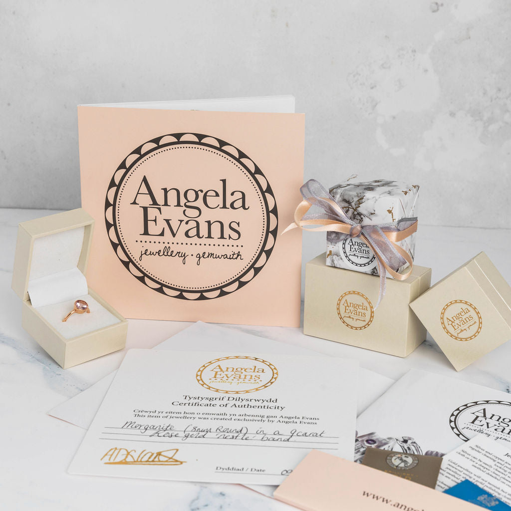 The finished, hallmarked ring arrives gift wrapped in one of our signature pearly white boxes. Delivery is made by a fully insured Royal Mail service.