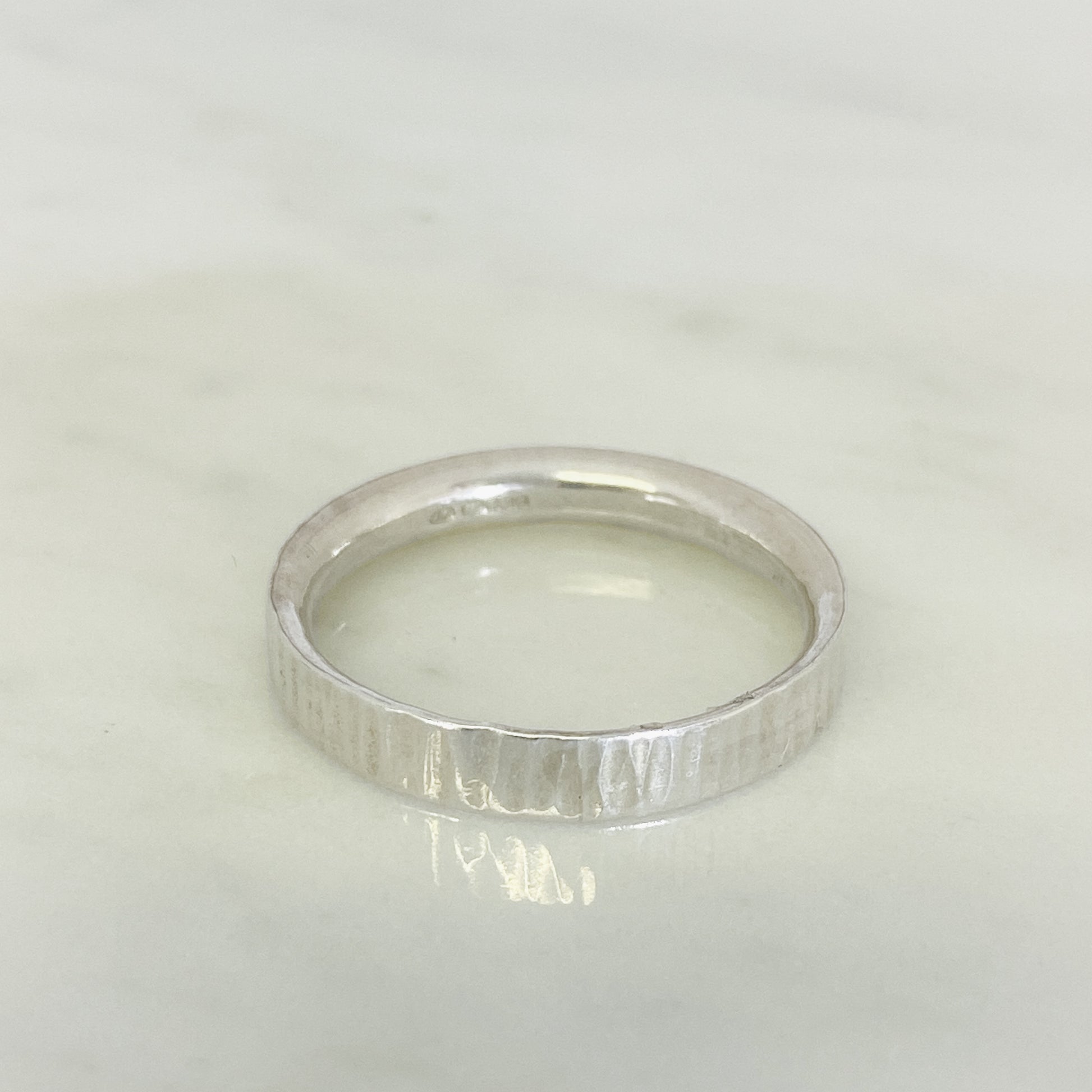 A contemporary take on a traditional ring in platinum with a hand hammered texture on the surface giving an organic striped effect.