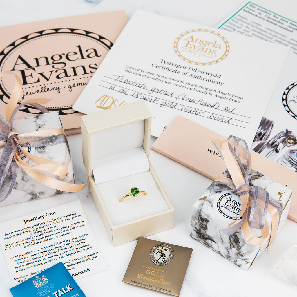 The finished, hallmarked ring arrives gift wrapped in one of our signature pearly white boxes. Delivery is made by a fully insured Royal Mail service.