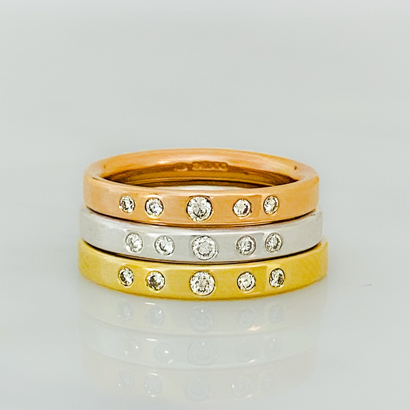 A contemporary take on a traditional ring in smooth polished rose gold with a line of 5 flush set sparkling diamonds set into a 3mm wide band. This piece can be worn as a wedding or eternity band.