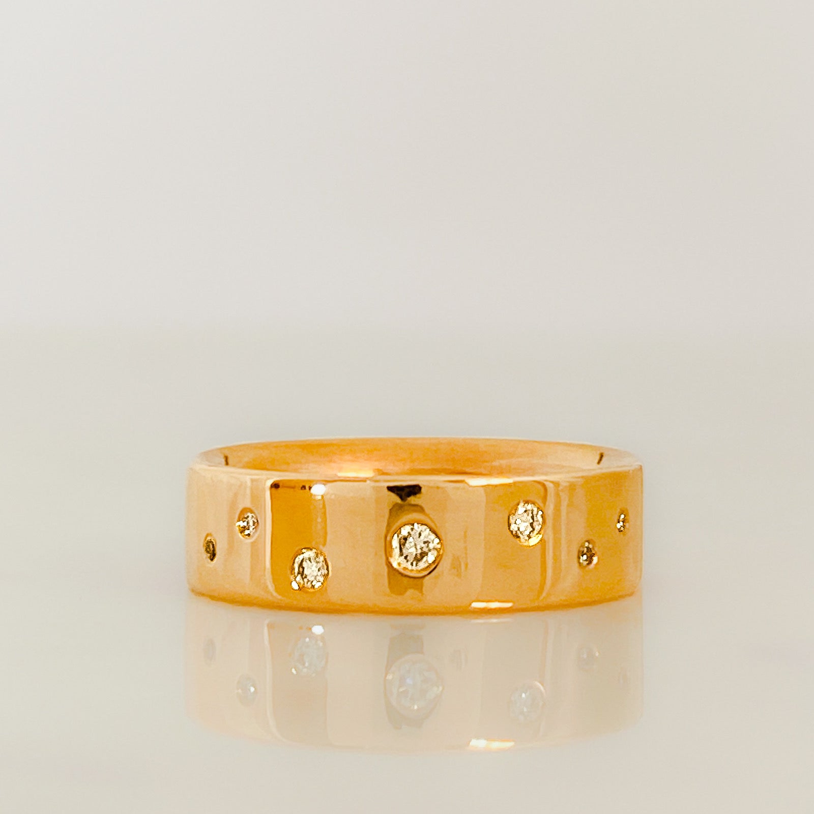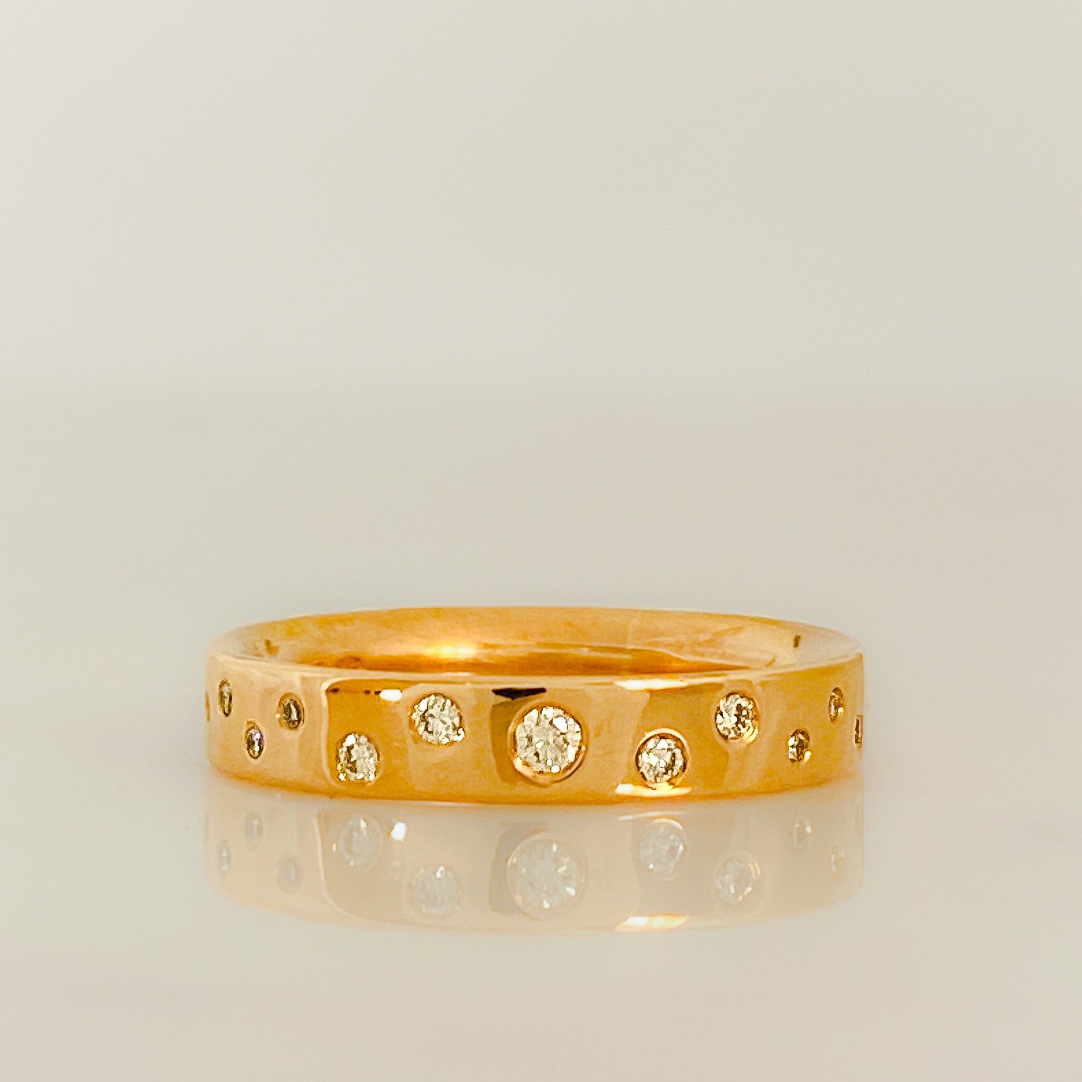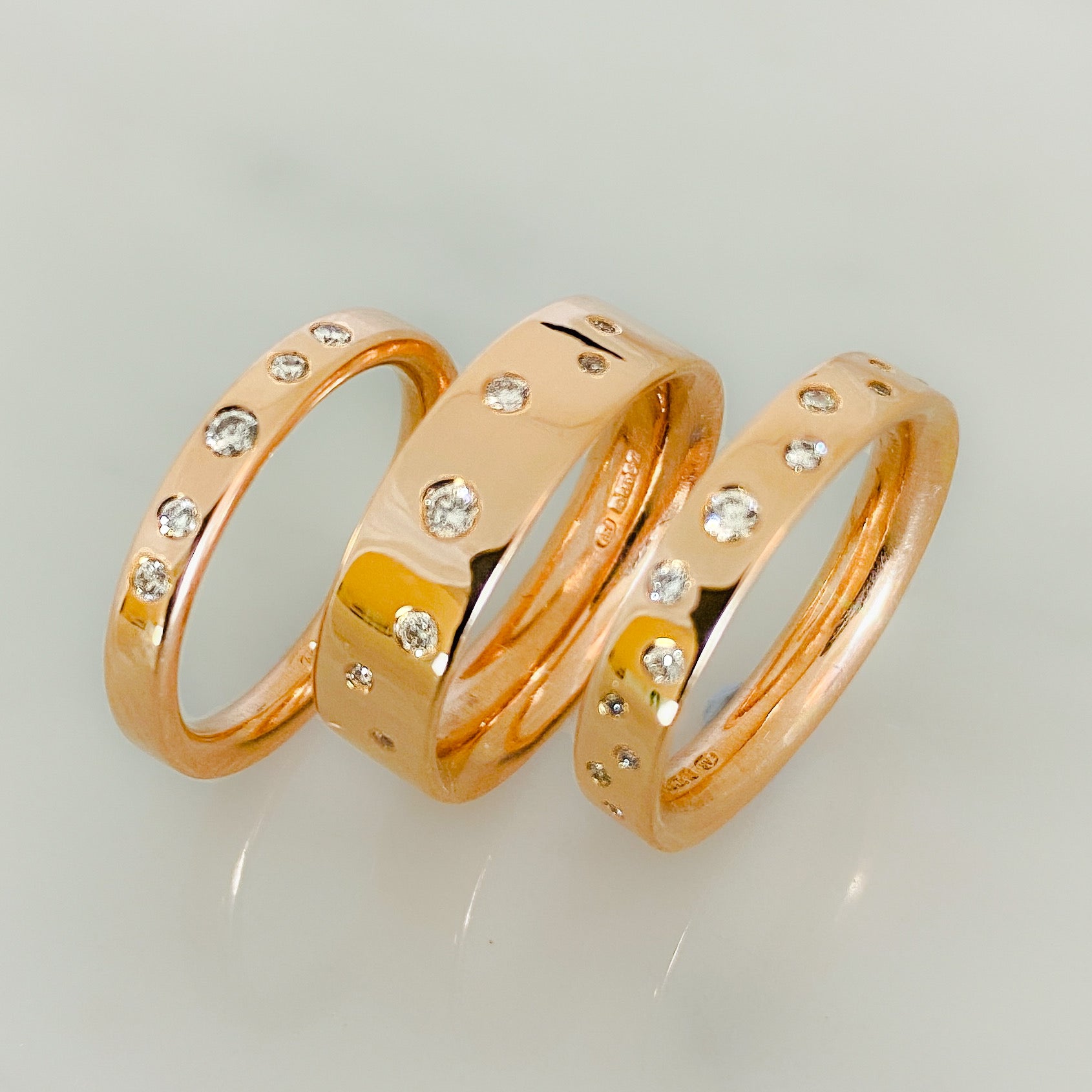 A contemporary take on a traditional ring in smooth polished rose gold with a scatter of flush set sparkling diamonds set into a 4mm or 6mm wide band. Choose from 5, 7 or 11 diamonds. This piece can be worn as a wedding or eternity band.