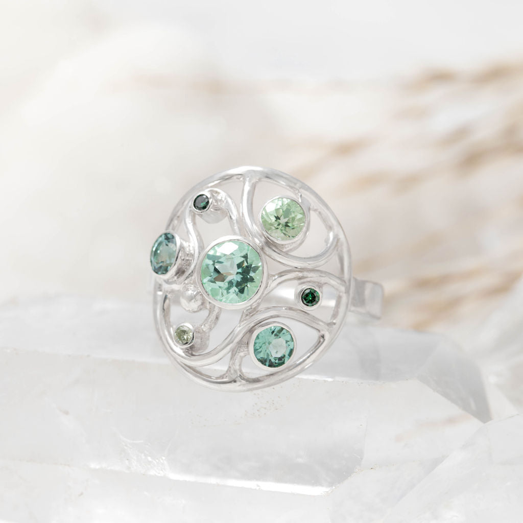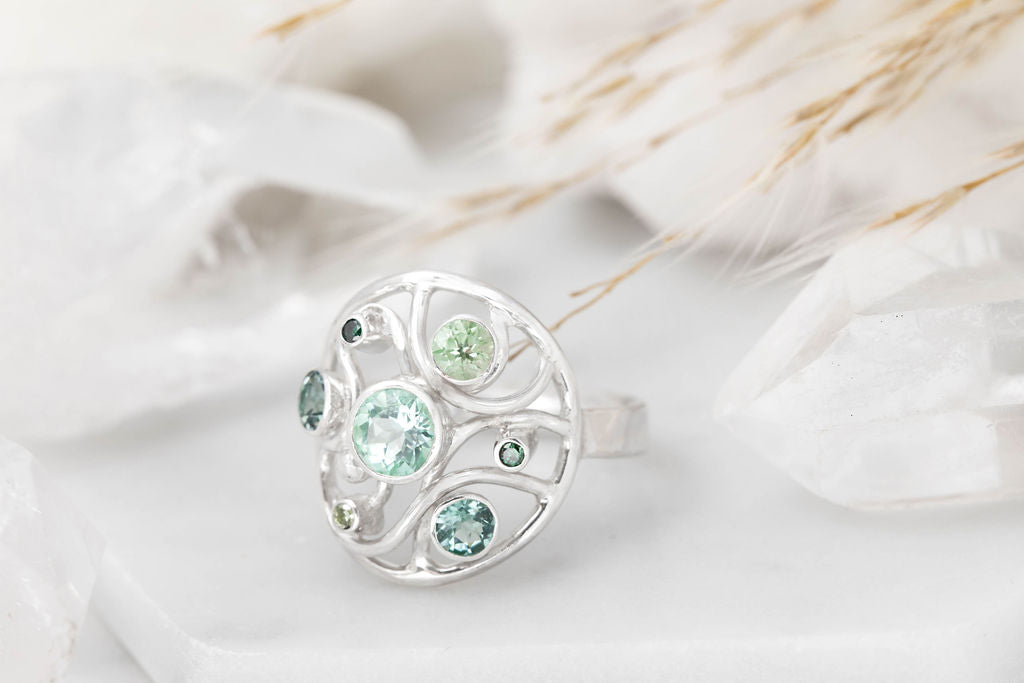 Always popular, Angela's multi stone rings feature a selection of stones in varying sizes and colours. Taking centre stage on this ring are a selection of stunning Fair Trade Tourmalines in shades of green , complimented by three irradiated green diamonds. The band is Sterling silver, decorated with granules of silver like drops of water. A truly unique piece to treasure for a lifetime.