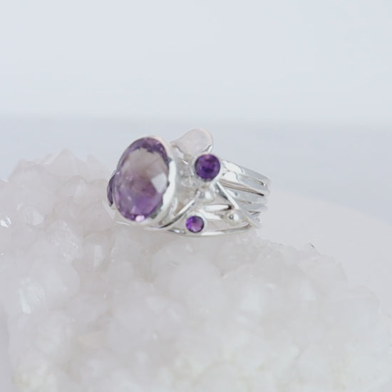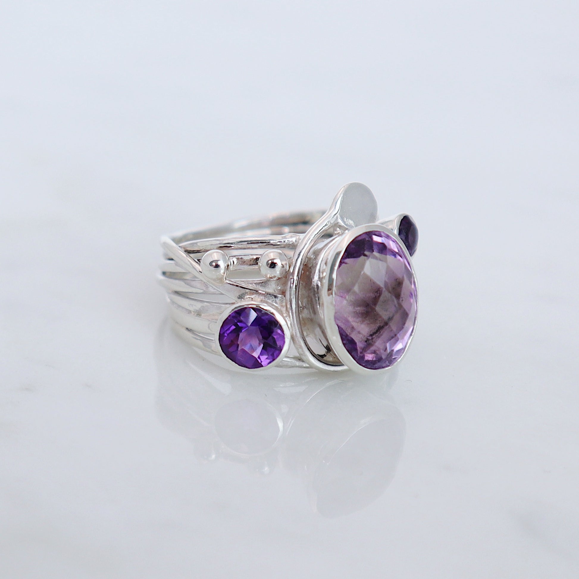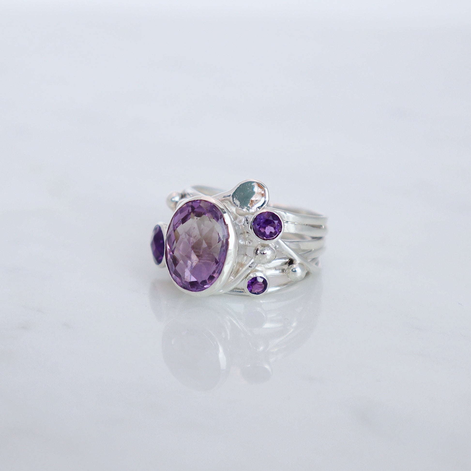 Always popular, Angela's flowing rings feature a selection of stones in varying sizes and colours. Taking centre stage on this ring is a stunning 12x10mm, 5.6ct chequerboard cut medium coloured Amethyst , complimented by three other darker Amethysts, a 6mm checkerboard round and a 4mm and 3mm round cut. The band is Sterling silver, decorated with granules of silver like drops of water. A truly unique piece to treasure for a lifetime.