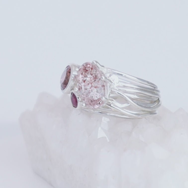 Always popular, Angela's flowing rings feature a selection of stones in varying sizes and colours. This ring features a stunning 4.1ct, 13x8mm ‘Super Seven’ Oval, along with a 10x8mm Tourmaline Oval and a 5mm round Ruby.