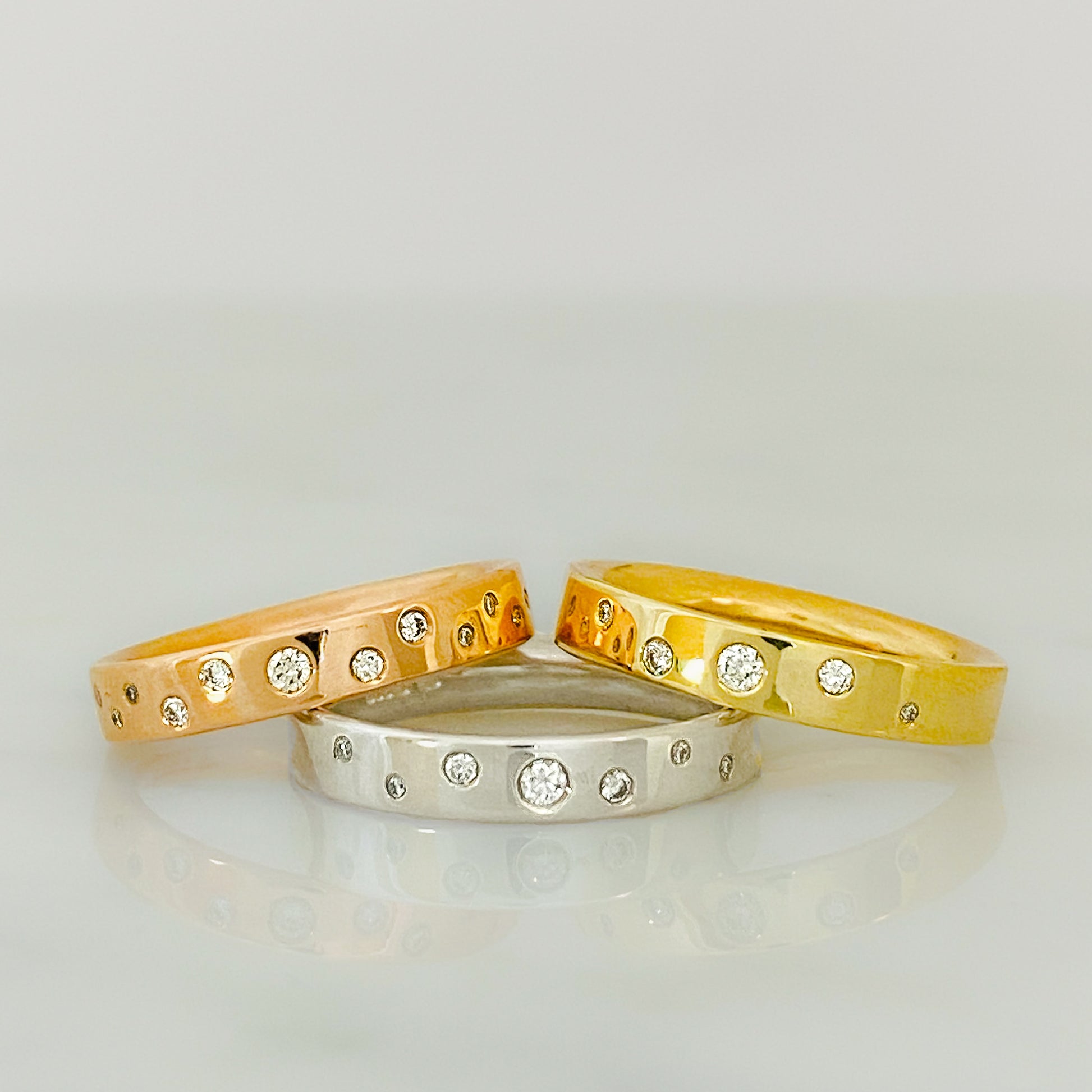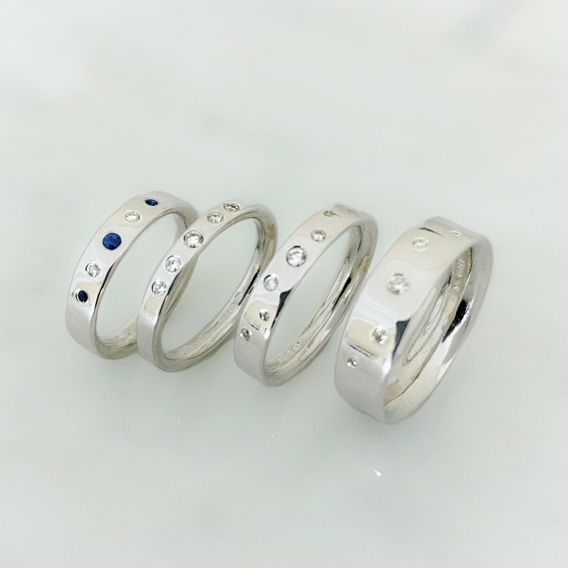 A contemporary take on a traditional ring in smooth polished sterling silver with a scatter of flush set sparkling diamonds set into a 4mm or 6mm wide band. Choose from 5, 7 or 11 diamonds. This piece can be worn as a wedding or eternity band.