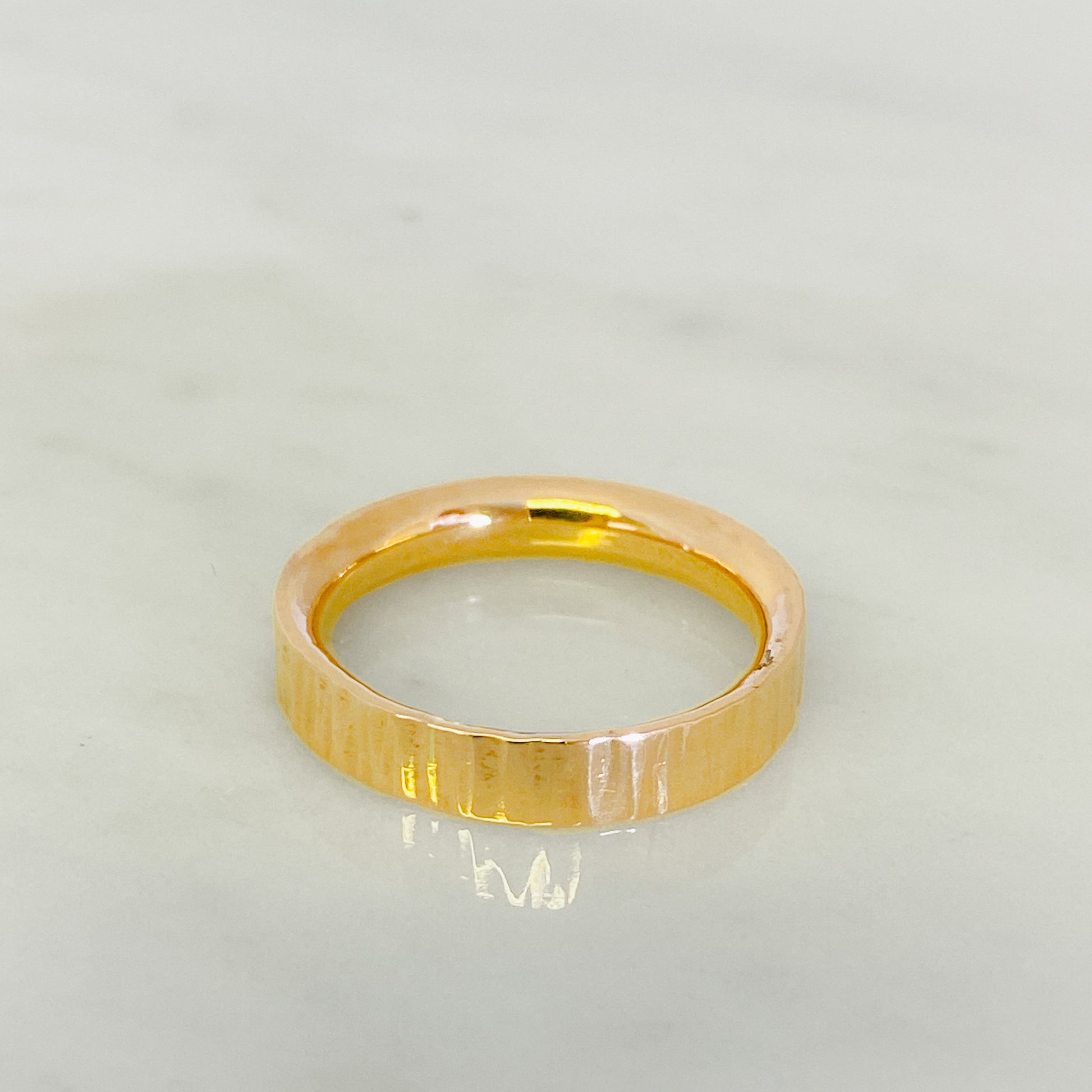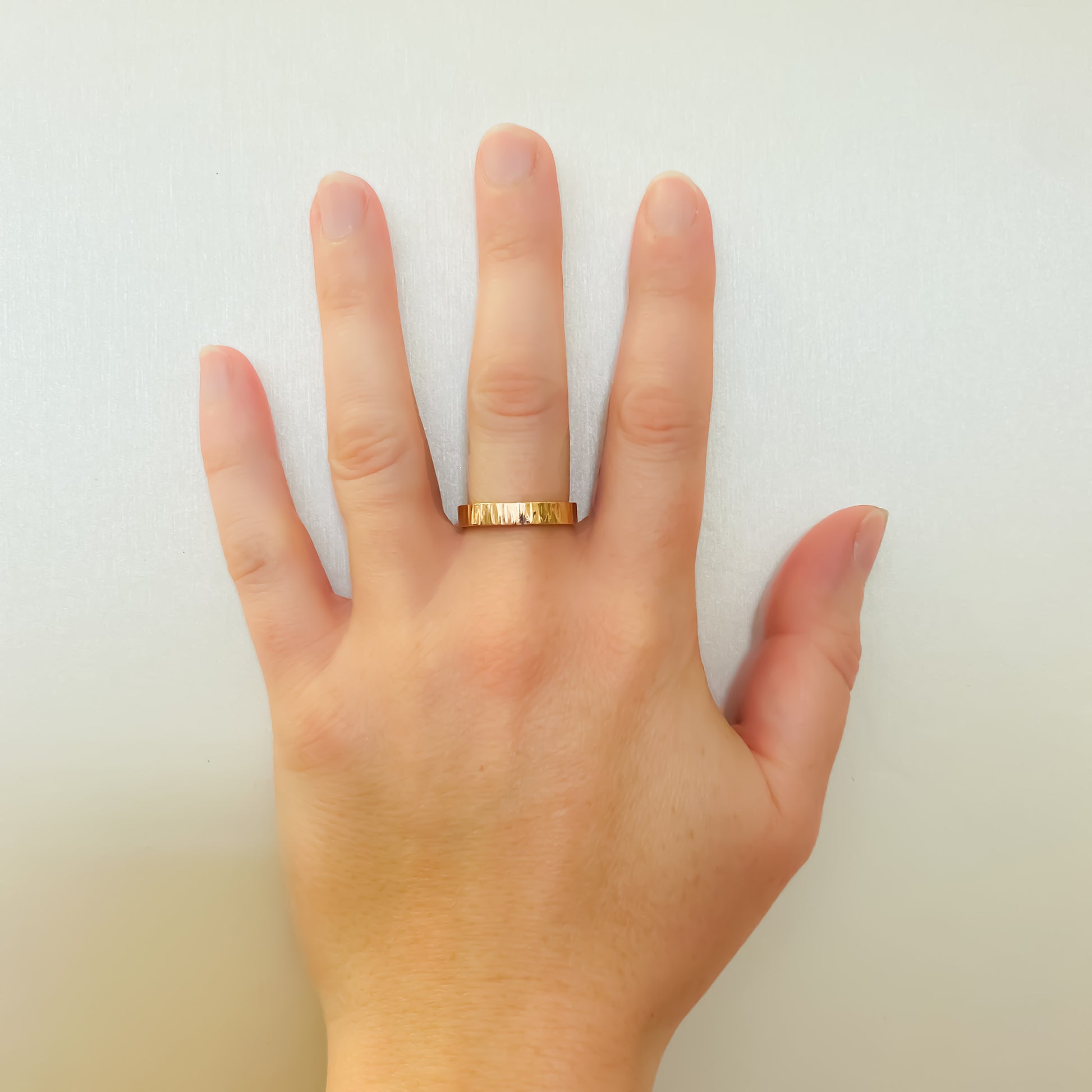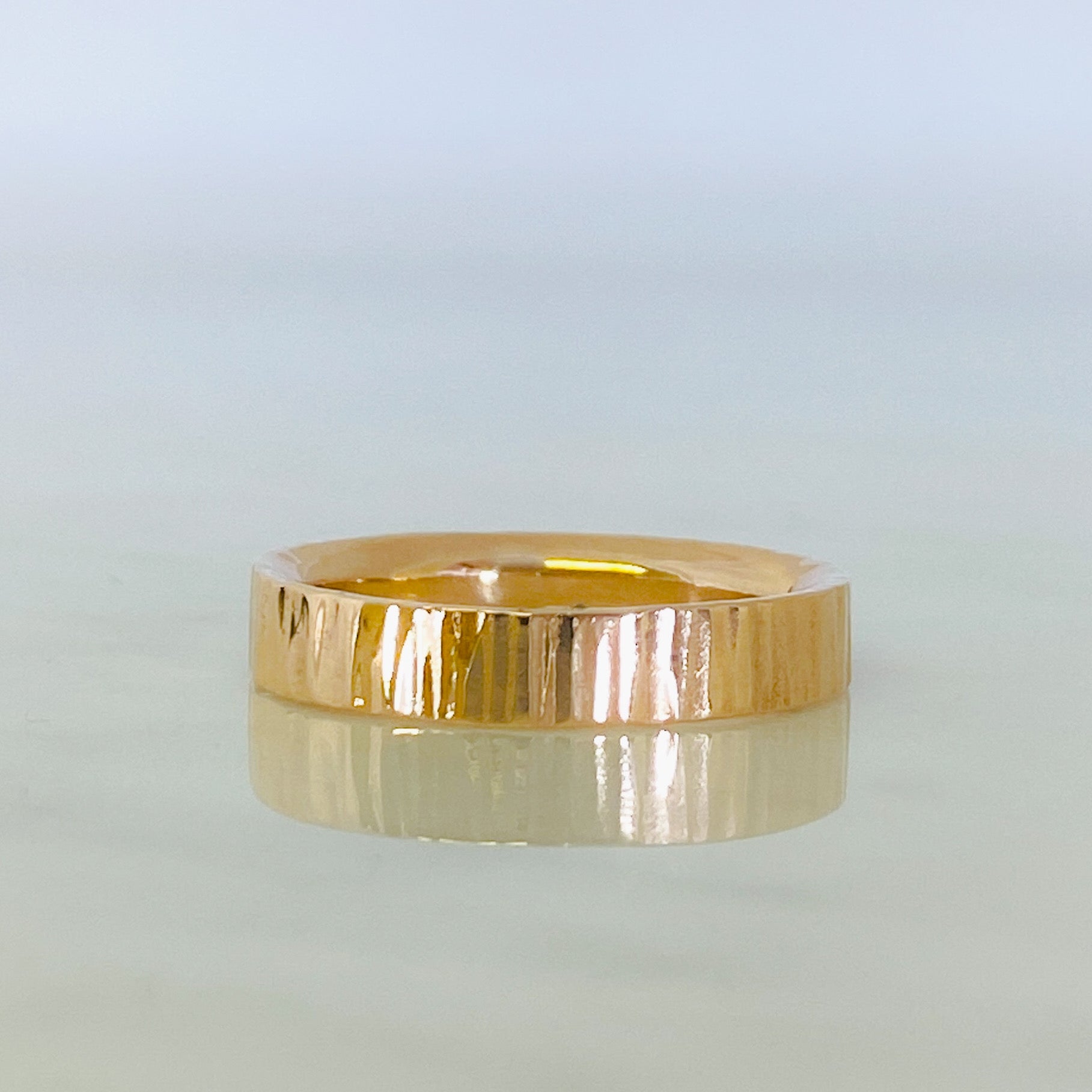 A contemporary take on a traditional ring in rose gold with a hand hammered texture on the surface giving a striped effect reminiscent of tree bark.