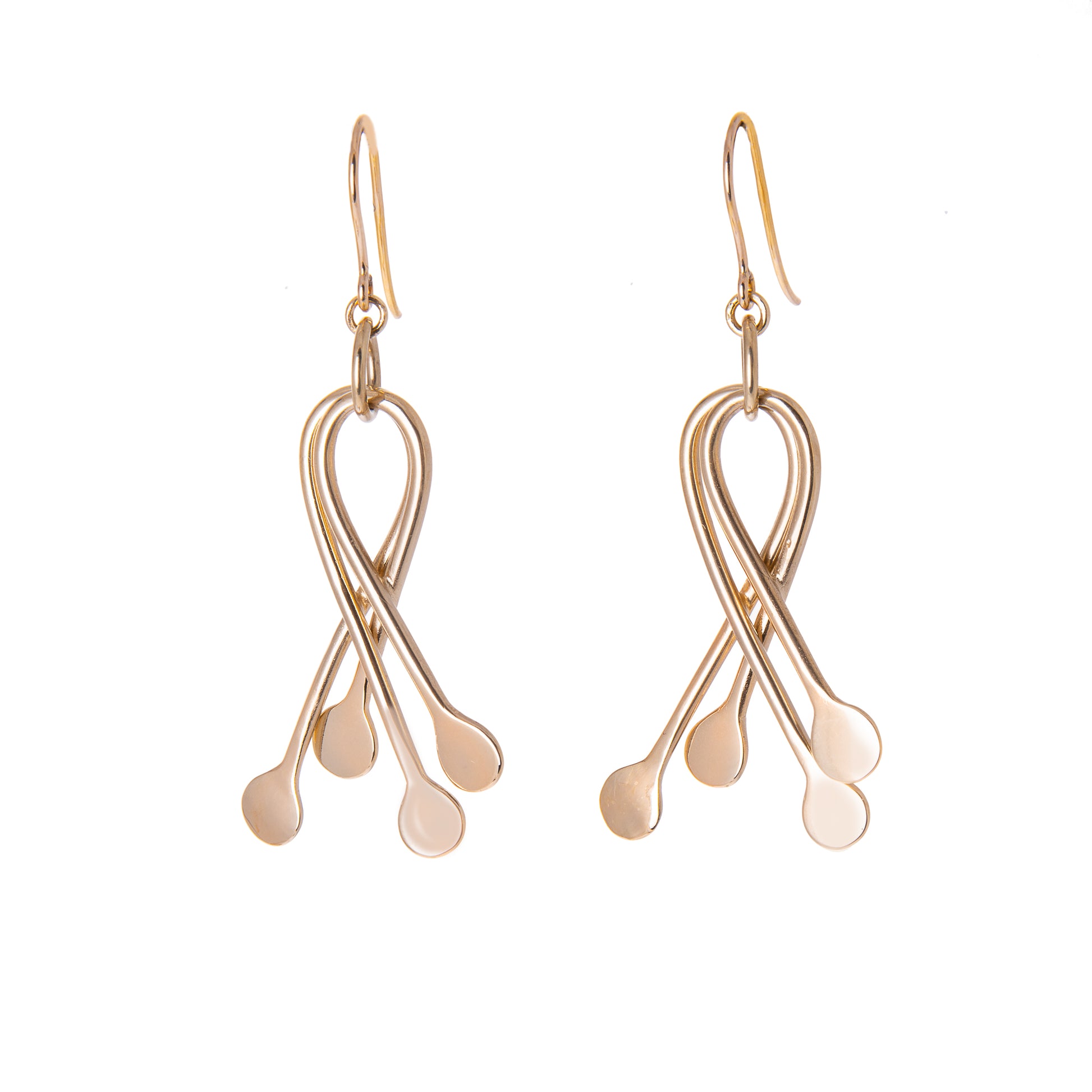 Two curves of gold with hammered details, each with a sweeping cross over, to create earrings with movement.
