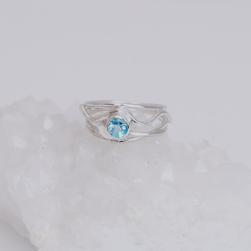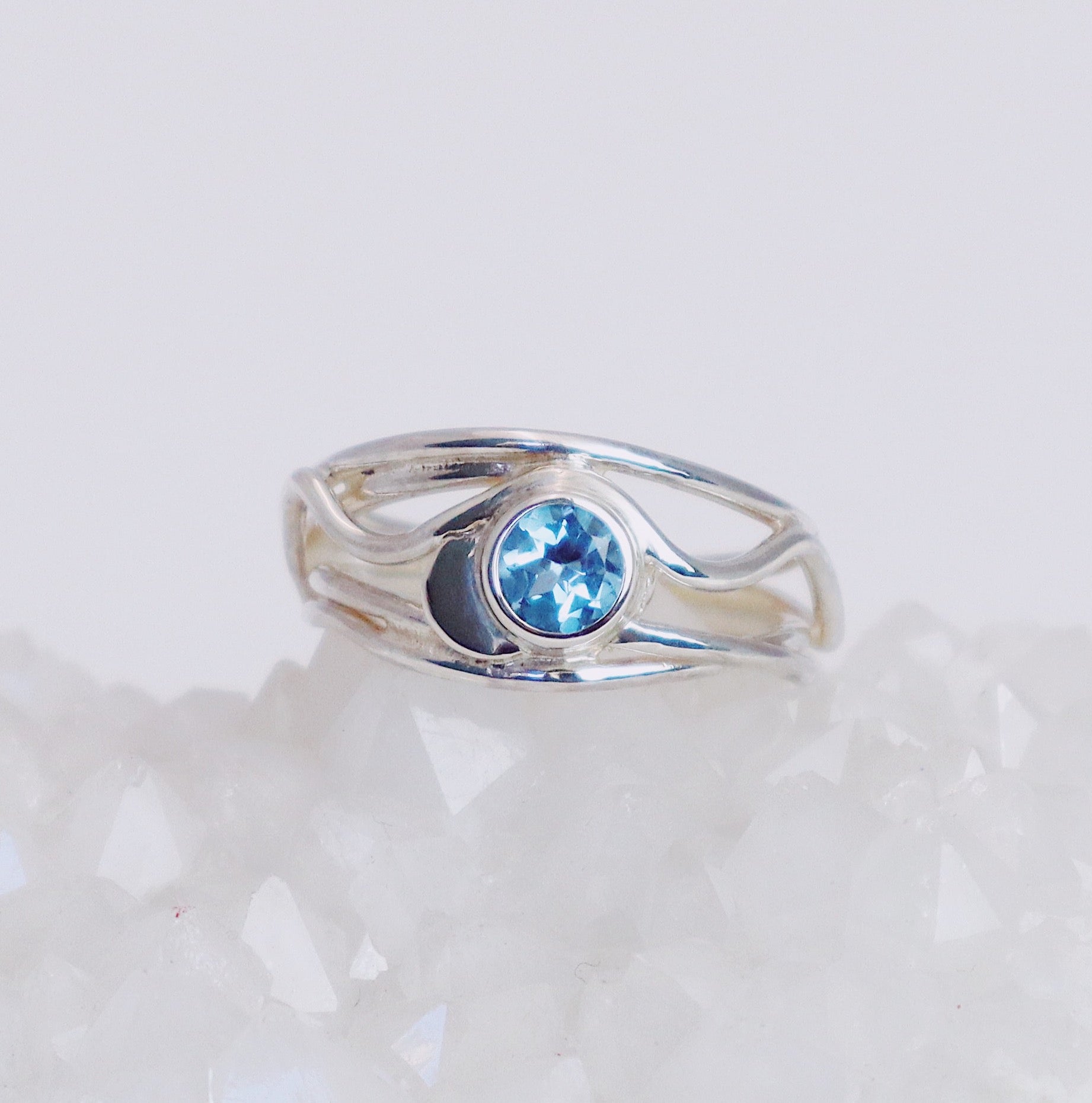 The Swiss Blue Topaz measures 5mm diameter. The band width is 6-10mm at widest point.